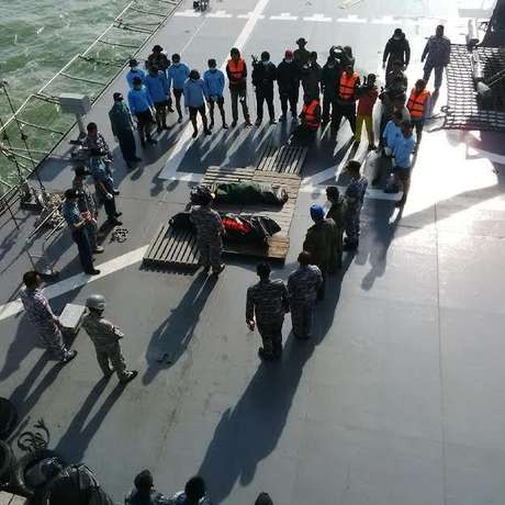 Sebelum diangkut helikopter, para kru di kapal sempat membentuk lingkaran mengelilingi jenazah. Mereka lalu berdoa.