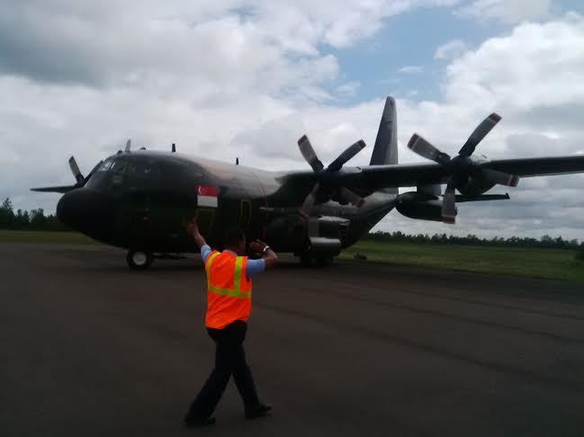 Pantauan di Lanud Iskandar, Pangkalan Bun, Kalteng, Kamis (1/1/2014), pesawat Hercules berbendera Singapura itu tiba pukul 10.10 WIB. Pesawat dipimpin Mayor Tank Tek Hong dengan membawa 7 orang personel.