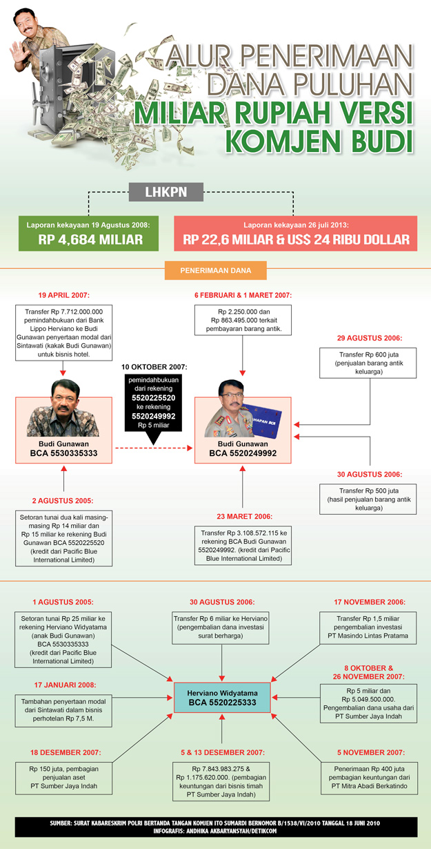 Berikut infografis alur penerimaan dana di rekening Komjen Budi dan anaknya berdasarkan surat Bareskrim yang disebar di DPR: