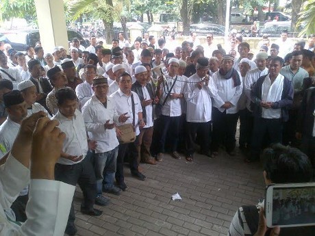 Mereka mengenakan baju koko putih dengan pita hijau di lengan kiri. Sebagian mengaku dari ormas sayap PPP dari Angkatan Muda Ka'bah di Tanah Abang.
