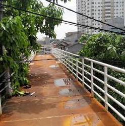 Terlihat juga kondisi JPO yang basah. Tidak terlihat ada masyarakat yang melewati JPO tersebut. Orang-orang menyeberang di jalan raya yang membahayakan jiwanya dan mengganggu lalu lintas.