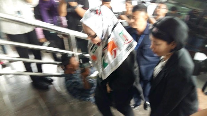 Sosok yang berkacamata hitam itu tak menjawab saat ditanya wartawan mengenai pemeriksaannya. Meski begitu, senyum terus merekah dari bibirnya yang dipoles tipis gincu merah.