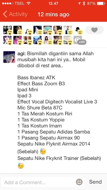 "Pas kita keluar, nggak ada yang mencurigakan, nggak ada yang pecah. Tap pas buka pintu kok ada yang kosong, ternyata tas, sepatu, bass, udah nggak ada," cerita Agi kepada detikcom, Sabtu (6/6/2015).