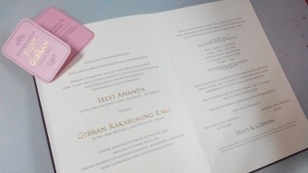 Saat undangan dibuka, setiap halaman berwarna putih gading dengan tulisan tinta warna emas. Di lembar pertama, terselip kartu pengambilan suvenir.