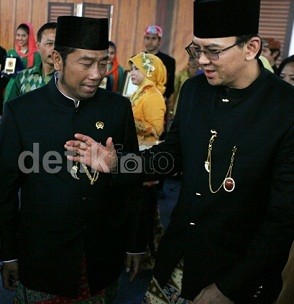 Politisi PPP itu memakai setelan jas dan dasi hijau plus peci, sementara Jokowi juga mengenakan setelah jas dan dasi merah plus peci. Senyum merekah terlihat di wajah mereka.