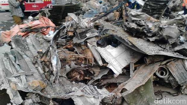 Puing-puing pesawat diamankan di pinggir jalan tak jauh dari lokasi evakuasi. Terlihat bagian-bagian pesawat berserakan. Kondisinya nyaris tidak berbentuk. Ada juga besi atau puing benda lain yang tak jelas bentuknya.