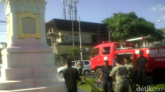 Seperti diberitakan, turis asal Ceko Yit Kampak Mga menyiramkan cat warna merah ke Tugu Yogya pada Minggu (5/7). Pelaku yang diduga dalam keadaan stres kemudian diamankan petugas. (rul/rul)