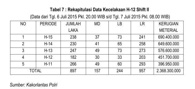 Berdasarkan data terakhir yang dirilis Selasa (7/7/2015), total ada 897 kecelakaan sepanjang jalur mudik. Dari kejadian itu, 157 orang meninggal dunia, 244 orang luka berat dan 957 orang luka ringan. Total kerugian akibat peristiwa tersebut diperkirakan Rp 2.368.300.000.