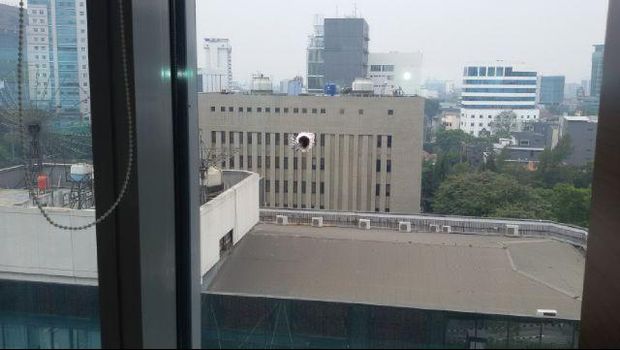Kapolres Jakarta Pusat Kombes Pol Hendro Pandowo mengatakan, lubang di kaca itu berukuran sekitar 2 mm. Masing-masing lubang berjarak satu sama lain sekitar 40 cm. Nah, besi yang menempel itu berukuran sekitar 3-4 mm. Bentuknya silinder tak beraturan.