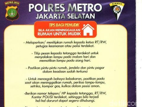 Polres Metro Jakarta Selatan mengeluarkan imbauan berupa 4 tips aman bagi masyarakat yang akan melaksanakan aktivitas mudik, maupun saat merencanakan libur lebaran di Ibukota.