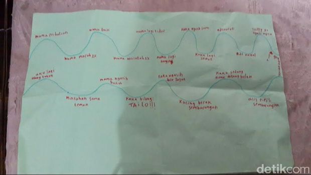 Neneng pun menunjukkan kertas maping history GT. Pada kertas itu terdapat tulisan GT yang menerangkan sejumlah hal. Seperti: mama perhatian, mama marah-marah, mama baik, mama merintah-merintah, mama lagi bangun, kakak ngasih jajan, kakak lagi sewot, ade nurut, ade nakal, skippy (anjingnya) nggak nyuci ayam.