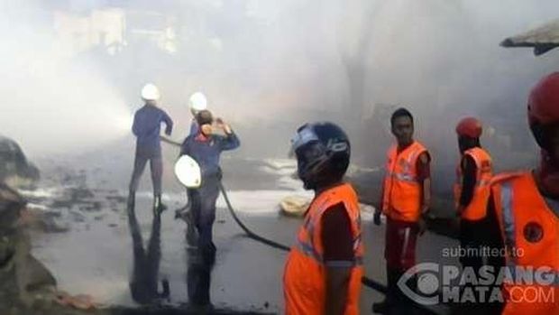 Jamal sempat mengirimkan foto-foto proses pemadaman kebakaran itu ke pasangmata.com. Terlihat petugas masih menyemprotkan air ke api yang masih berkobar di pabrik tersebut.