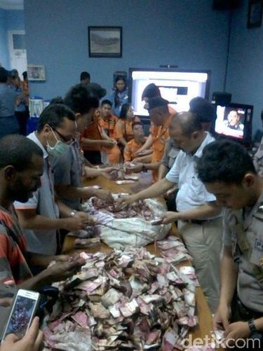 Dari foto yang diperoleh detikcom, Rabu (19/8/2015), duit yang masih berada di dalam karung beras itu ditaruh meja panjang. Ada sekitar 8 orang yang tengah mengecek uang tersebut.