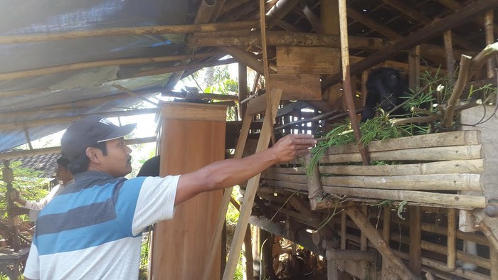 Di sudut belakang rumah tempat tinggalnya, ada bilik sederhana berukuran 6x5 yang dijadikan tempatnya berkarya. Tak hanya sebagai tempat kerjanya saja, bilik tempatnya memotong kayu dan membuat perabot kayu itu juga bercampur dengan kandang kambing miliknya.