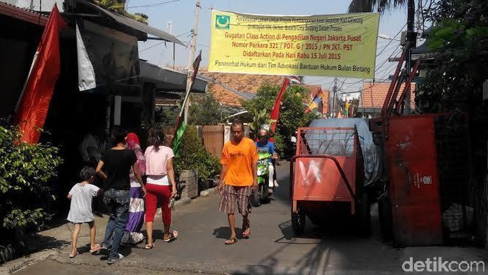 Pantauan detikcom di kawasan permukiman kelas menengah tersebut terpasang sebuah spanduk sepanjang 2x6 meter bertuliskan "Pembebasan lahan untuk proyek pembangunan inlet sodetan kali Ciliwung di wilayah RW 04 sedang dalam proses. Gugatan class action di PN Jakarta Pusat dengan nomor perkara 321/PDT.G/2015/PN.JKT.PST." Gugatan tersebut telah didaftarkan pada tanggal 15 Juli 2015.