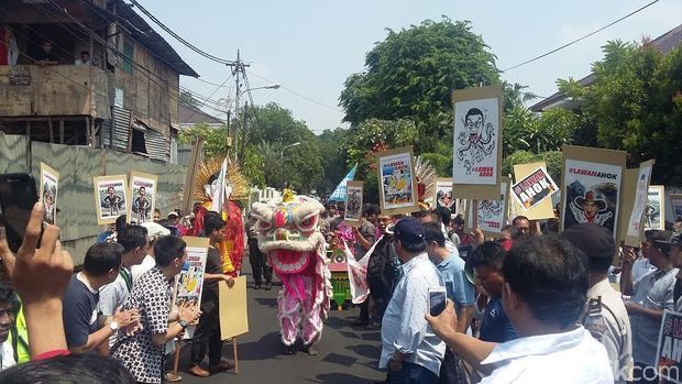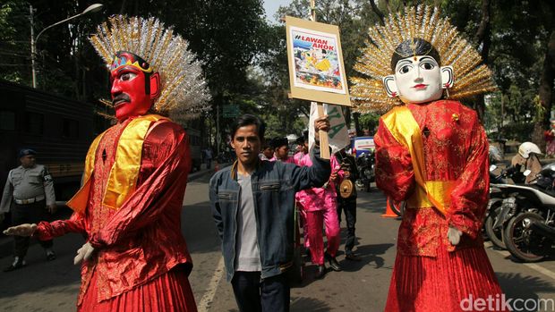 Mereka juga membawa sepasang ondel-ondel lengkap dengan musiknya, 1 barongsai berwarna merah muda dan peraga pencak silat. Tak pelak, demo di rumah dinas Ahok menjadi pagelaran seni.