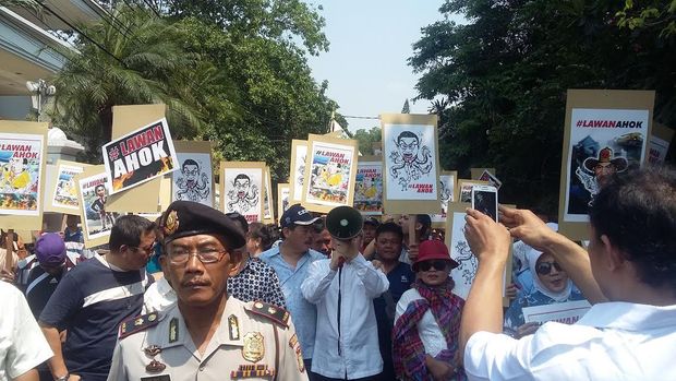 Pendemo datang membawa poster bertuliskan #Lawan Ahok yang dicetak rapi dan poster berisi protes.