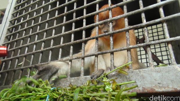 Di dalam kandang besi berukuran 1 meter itu, bekantan berambut warna cokelat kemerahan sedang asyik makan pakis.