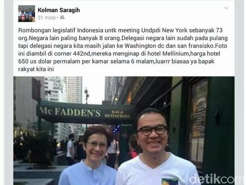 'Rombongan legislatif Indonesia untuk meeting UNDP di New York sebanyak 73 orang. Negara lain paling banyak 8 orang. Delegasi negara lain sudah pada pulang tapi delegasi negara kita masih jalan ke Washington DC dan San Fransisco. Foto ini diambil di corner 442nd, mereka menginap di hotel Millenium, harga hotel 650 us dollar per malam per kamar, luarr biasa ya bapak rakyat kita ini,' tulis akun tersebut.