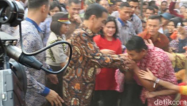 Jokowi memakai batik cokelat dan Iriana berbaju merah bergandengan saat melintasi jalan masuk yang sempit. Lokasi pembagian terletak di sebuah tanah kosong, tetapi sebelumnya harus melewati sisi selokan dengan lebar jalan kurang dari 1 meter yang kemudian melebar.