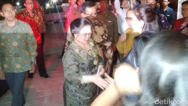Acara digelar di Galeri Nasional Indonesia, Jalan Medan Merdeka Timur, Jakarta Pusat, Selasa (8/9/2015). Megawati tiba di lokasi acara sekitar 20.30 WIB. Presiden RI kelima ini terlihat mengenakan baju batik warna hijau. Di acara ini, Megawati rencananya akan membacakan sebuah naskah kuno.
