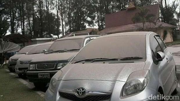 Abu vulkanik dari erupsi Sinabung juga menyebar di permukiman warga. Dari foto yang dikirimkan Marga Lubis, tampak debu vulkanik menempel di atap bangunan dan mobil-mobil yang terparkir.