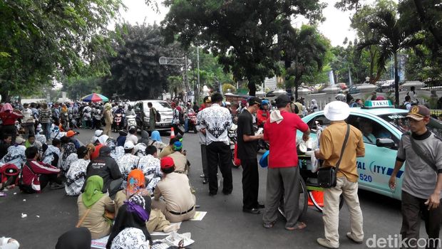 Jakarta - Ribuan guru honorer berjalan kaki dari Gedung DPR ke Kemen PAN-RB di Jalan Jend Sudirman untuk melanjutkan aksi demo. Namun karena kelelahan, mereka memilih beristirahat dulu di depan Gedung Kemenpora.
