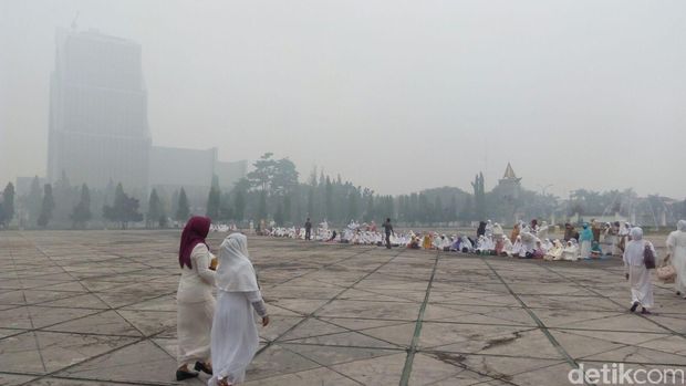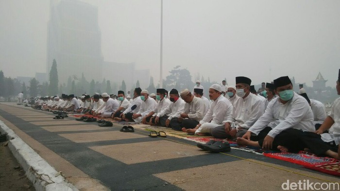 Bait-bait doa terucap diiringi isak tangis. Air mata jemaah pun menetas di atas alas salat."Sehubungan dengan musibah kabut asap dan kemarau panjang sehingga kita menggelar salat istisqa," kata Ketua MUI Riau Nazir.