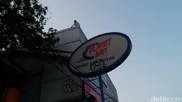Fitri tampak berjalan di sisi depan atap lantai satu rumah tersebut, kemudian berpindah ke ruko sebelahnya yang menjual ban. Dengan tenangnya dia berjalan di papan nama ruko tersebut, kemudian secara mengejutkan bergelantungan di sebuah besi dengan kaki di atas.