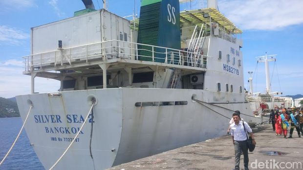 "Jadi mereka melakukan transhipment (alih muatan) di sekitar pulau Daru (Papua Nugini) dan menampung hasil tangkapan dari kapal-kapal eks Mabiru dan Benjina yang di wilayah kita," kata Menteri Susi saat mendatangi kapal Silver Sea 2 di Lanal Sabang, Jumat (25/9/2015).