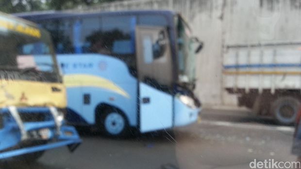 Menurut saksi mata di lokasi, Patricia, kejadian terjadi sekitar pukul 16.00 WIB, Senin (28/9/2015). Akibat kecelakaan terlihat bagian depan truk rusak parah, demikian juga bagian depan sebelah kanan bus.