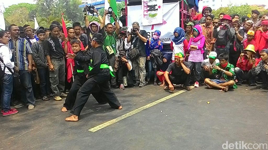 Di depan Istana, mereka mendengarkan orasi dan melakukan aksi teatrikal berupa pencak silat.