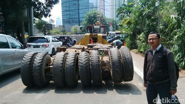 Truk trailer melintang tepat di depan Hotel Sahid Jaya dari arah Semanggi menuju Bundaran HI. Alat berat itu mau melintasi jalur lambat untuk menuju jalur cepat ke arah pembangunan proyek MRT. (aws/aan)