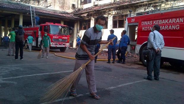 Berbekal sapu dan cangkul, sejumlah anggota menyebar di sekitar gedung dan di dalam gedung B, Kamis (1/10/2015). Mereka membersihkan genting dan kayu-kayu yang berserakan dan dikumpulkan di tepi gedung.