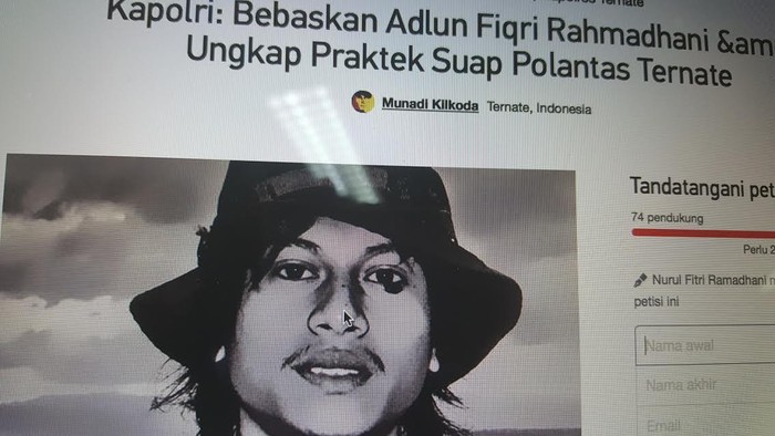 Seperti dikutip detikcom, Jumat (2/10/2015) di lamab change.org yang dibuat Munaldi Kilkoda, petisi itu ditujukan ke Kapolri, Kapolda Maluku Utara, dan Kapolres Maluku Utara. 'Kapolri: Bebaskan Adlun Fiqri Rahmadhani & Ungkap Praktek Suap Polantas Ternate', demikian tema petisi itu.