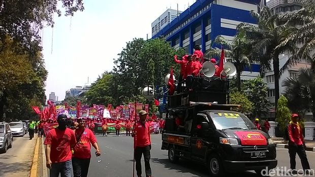 Jakarta - Massa buruh yang tergabung dalam Konfederasi Aliansi Serikat Buruh Indonesia (KASBI) melakukan aksi menuntut kesejahteraan kaum buruh. Aksi mereka ini menutup Jl Medan Merdeka Utara.