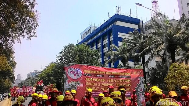 "Hidup kaum buruh, hapuskan sistem outsourcing. Berikan upah layak dan tolak RPP pengupahan," pekik si orator di depan Istana Merdeka pada Sabtu (03/10/2015).