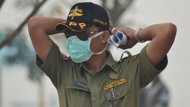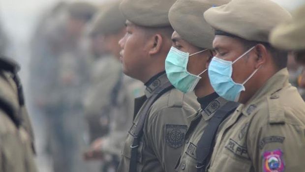 Anggota Satpol PP menggunakan masker untuk menghalau asap (Iqbal/detikcom) |