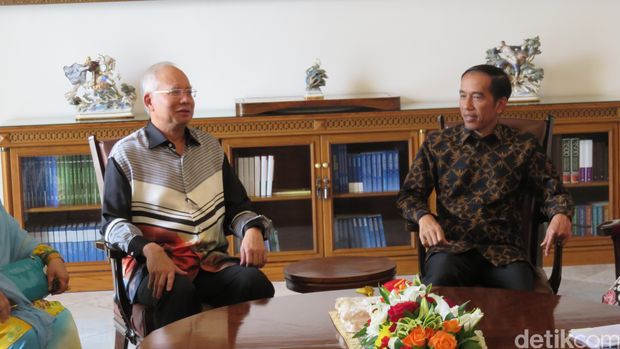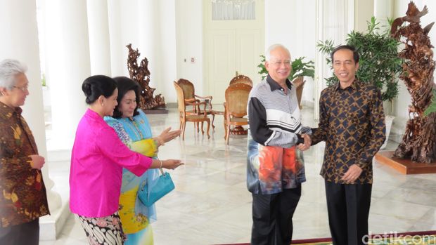 Pantauan detikcom, PM Najib beserta istri tiba di Istana Bogor pukul 13.40 WIB, Minggu (11/10/2015). Najib berbatik lengan panjang sementara sang istri mengenakan kebaya biru muda. Keduanya disambut oleh Presiden Jokowi dan Ibu Negara Iriana yang juga mengenakan batik merah muda.