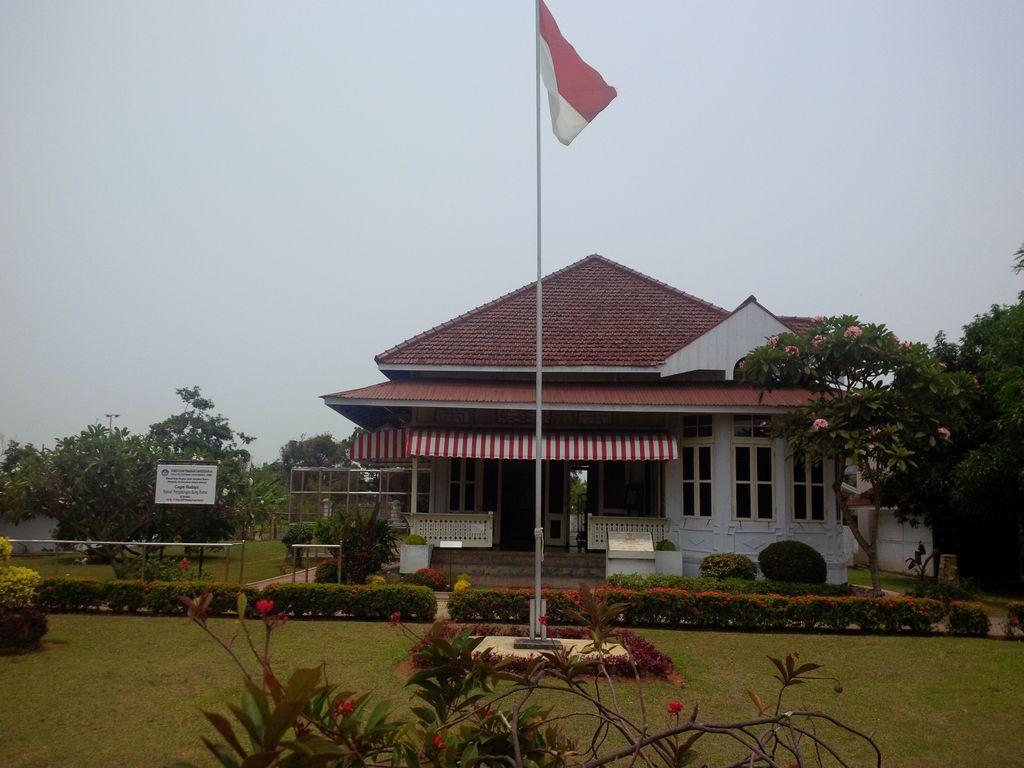 Di halaman berdiri tiang dengan bendera merah putihnya. Di sekelilingnya, tanaman perdu dan rumput tampak hijau memucat karena kemarau panjang.