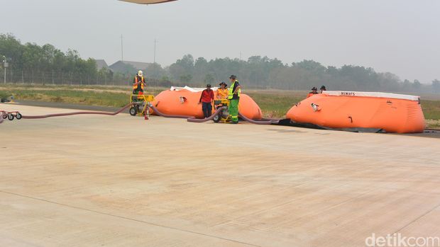 Tim lainnya bertugas mengisi air ke dalam 2 kantung besar berwarna oranye. Nantinya saat pesawat tiba, air tersebut langsung dialirkan ke tanki pesawat untuk kemudian dilakukan memadamkan api.