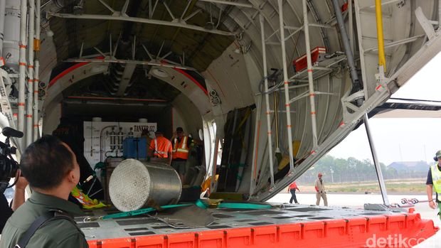 Pesawat Tanker Air Lockheed L100 atau biasa disebut Thor ini berkapasitas 15 ribu liter air. Pesawat ini akan menyemprotkan air ke titik-titik yang masih terbakar.