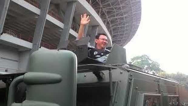 Ahok, Tito, Teddy, dan Maruarar merapat ke GBK naik kendaraan militer yang disebut komodo. Ahok keluar dari sela-sela kap mobil dan melambaikan tangan.