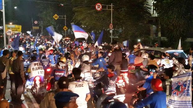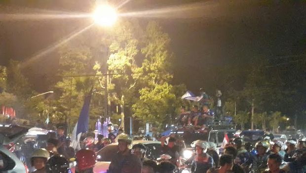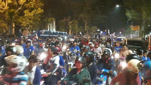 Suasana malam di pusat kota Bandung, Minggu (18/10/2015), meriah lantaran bobotoh berkonvoi menggunakan kendaraan roda dua dan empat. Para suporter fanatik Persib ini yang mayoritas kawula muda terus bergelombang melintasi Jalan Asia Afrika. Ruas jalan tersebut menjadi lautan bobotoh yang beratribut Persib.