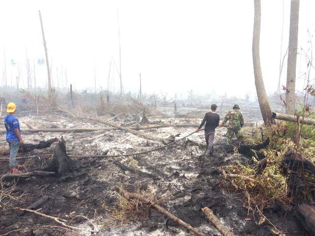 Sejak tadi pagi, pasukan Marinir bersama Koramil Meranti dan masyarakat desa bahu membahu untuk memadamkan bara api di lahan gambut. Kobaran api sudah berjalan sepekan ini tak kunjung padam.