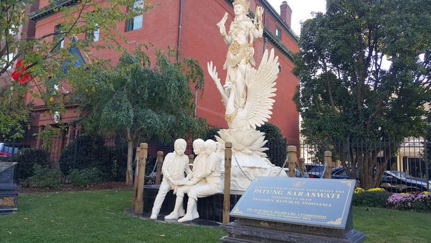 Saat detikcom menyambangi KBRI Washington, Jumat (23/10/2015) siang waktu DC, terlihat Staf KBRI Biyakto tengah berusaha menghapus tanda bintang di patung tersebut. Patung yang dicoret ialah patung Saraswati dan dua anaknya yang diresmikan Susilo Bambang Yudhoyono saat menjadi presiden.