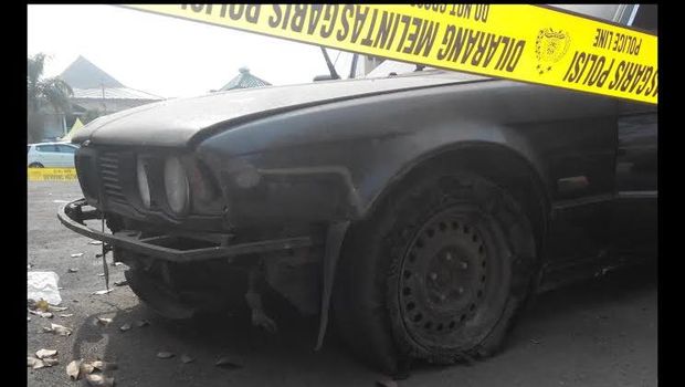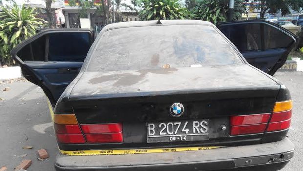 Mobil BMW itu kini diamankan polisi di halaman parkir Polsek Pulogadung, Jakarta Timur, Sabtu (24/10/2015). Garis polisi menghiasi mobil yang diselimuti debu tebal.