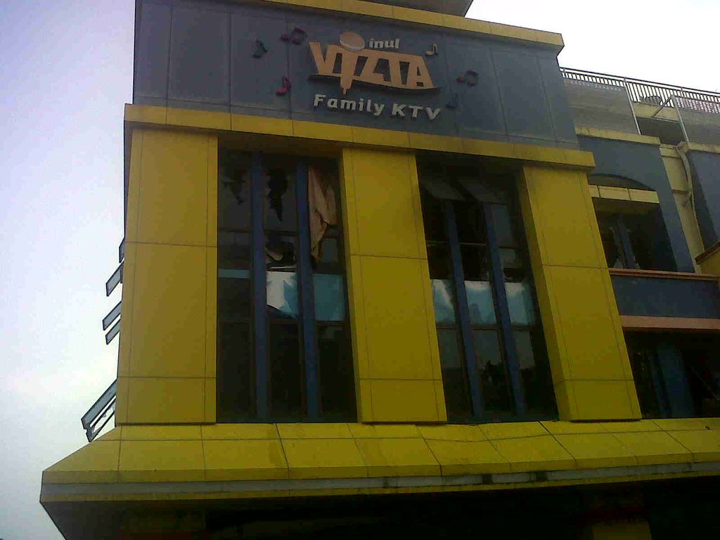 Melihat ke jendela di bawah lambang "Inul Vizta Family KTV" itu, kain tirai jendela masih ada yang nampak menjuntai.