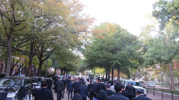 Jokowi memilih jalan kaki dari Blair House yang berada di Pennsylvania Avenue menuju US Chamber di H Street. Jaraknya sekitar 250 meter. Suhu di Washington cukup dingin sekitar 14-15 derajat celcius.