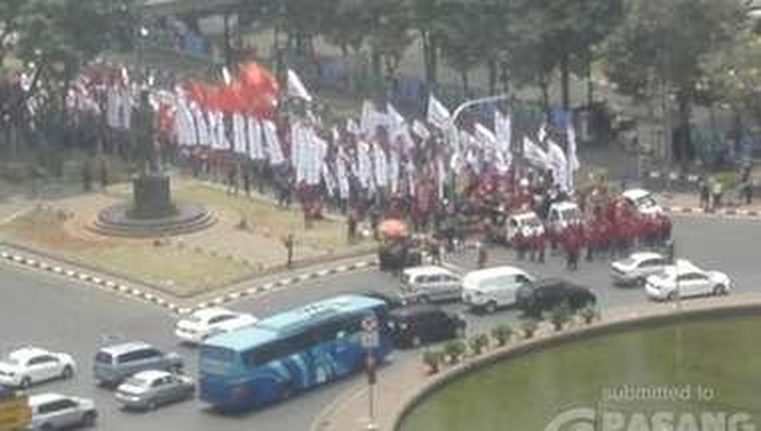 "Saat ini buruhnya masih berkumpul di depan Patung Kuda. Mereka menuhin jalan (Medan Merdeka Selatan) juga," kata kontributor pasangmata.com B. Yoso saat dihubungi pukul 11.28 WIB, Rabu (28/10/2015).